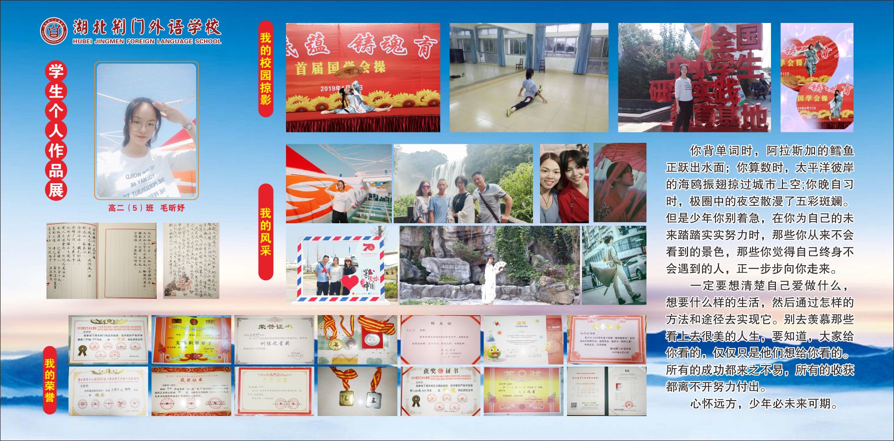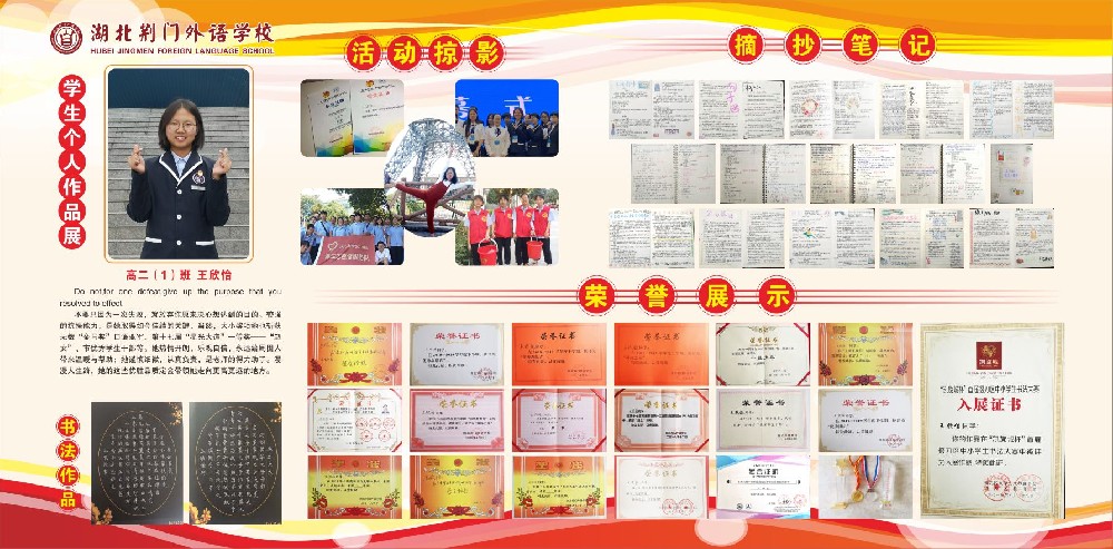 为了给学生提供展现自我的平台,浓厚校园文化氛围,促进学生全面发展,高中部开展了学生个人作品展活动。从大量的申请者中选出两名同学的作品作为第一期展出。她们是高二(1)班的李欣怡同学和高二(5)班的毛昕妤同学。作品展出后,深受师生的好评。