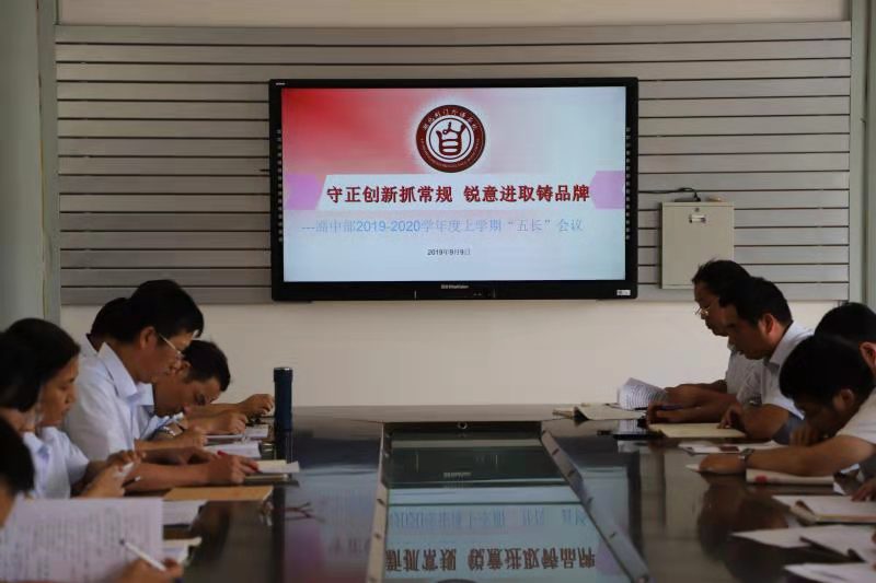 9月9日,高中部在二楼会议室召开主题为“守正创新抓常规 锐意进取创品牌”的2019-2020学年度上学期“五长”会议。高中部所有年级级长、备课组长、教研组长、课题组长参加会议。会上教务处马献新主任就本学期教务处工作进行发布,李化云主任对高三年级培优工作进行布置;教科室魏义兵主任对本学期科研工作进行发布;内审部汤芦保主任对集体备课细则进行说明;信息中心孟凡刚主任对学校一体机使用管理和综合素质评价相关问题进行说明;王俊侠助理对我校本学期社团活动进行安排。最后黄松华副校长作了“强化常规管理 落实责任担当”的主题发言,杨清校长对所有参会人员就教科研各项工作提要求。会议由胡岸主任主持。
