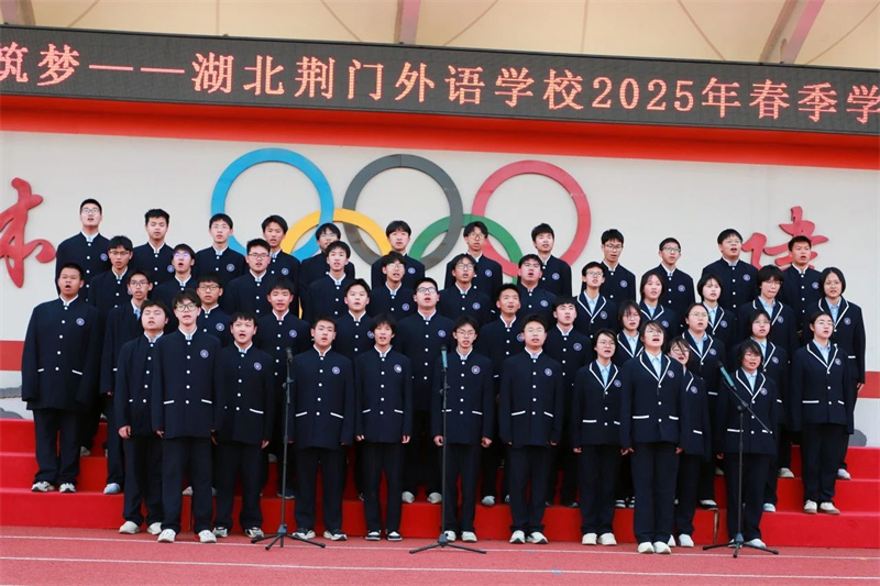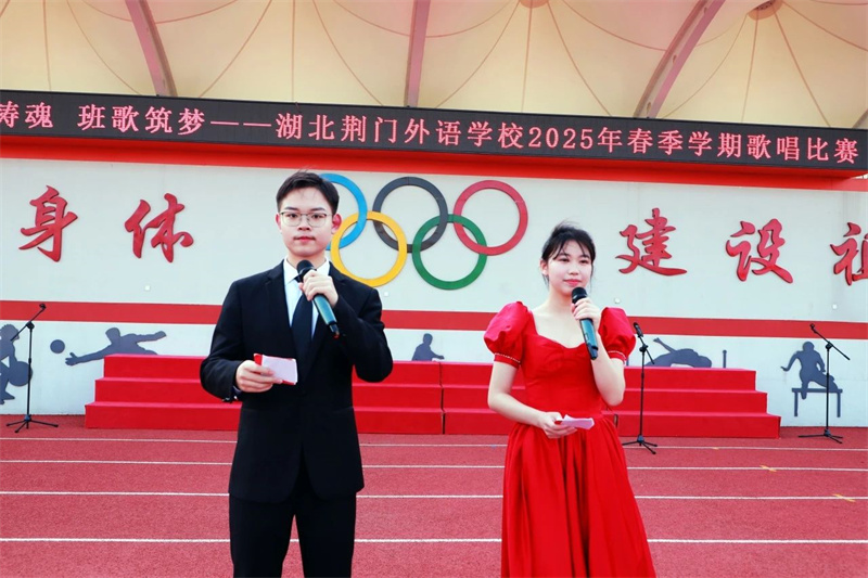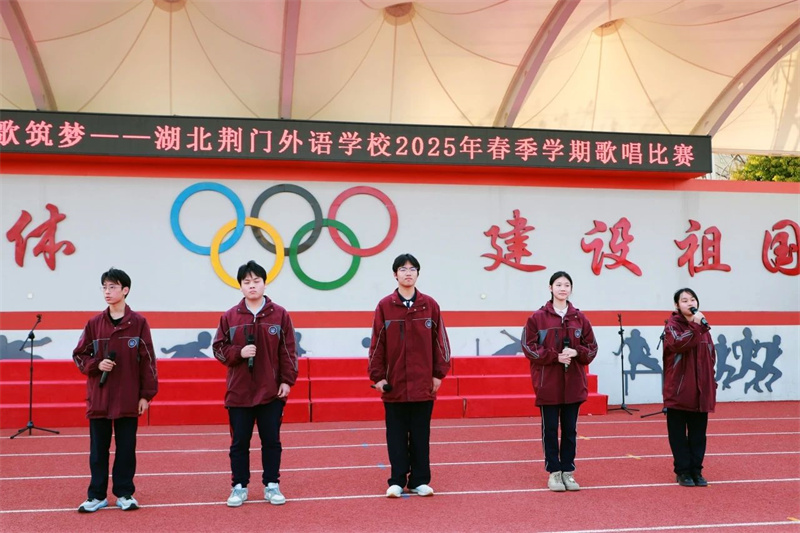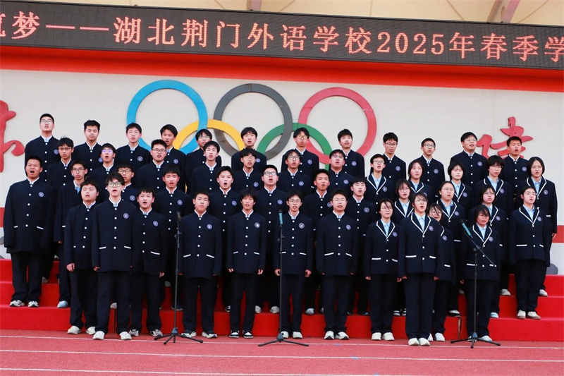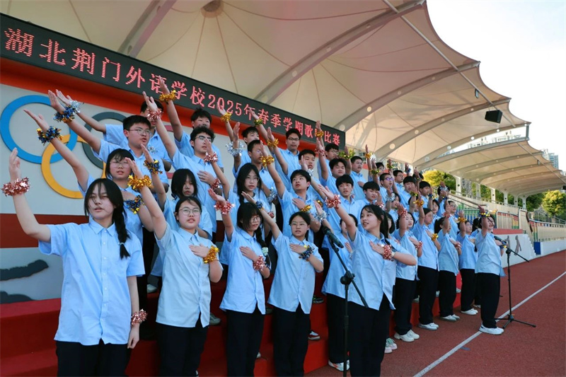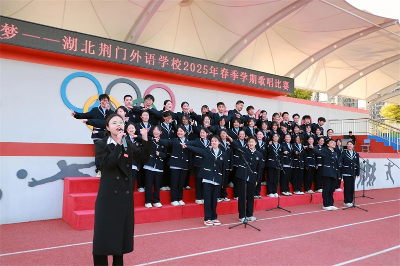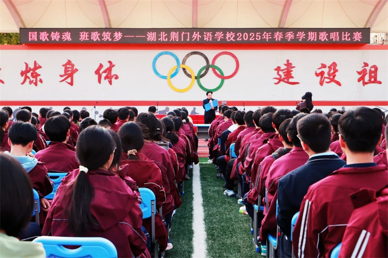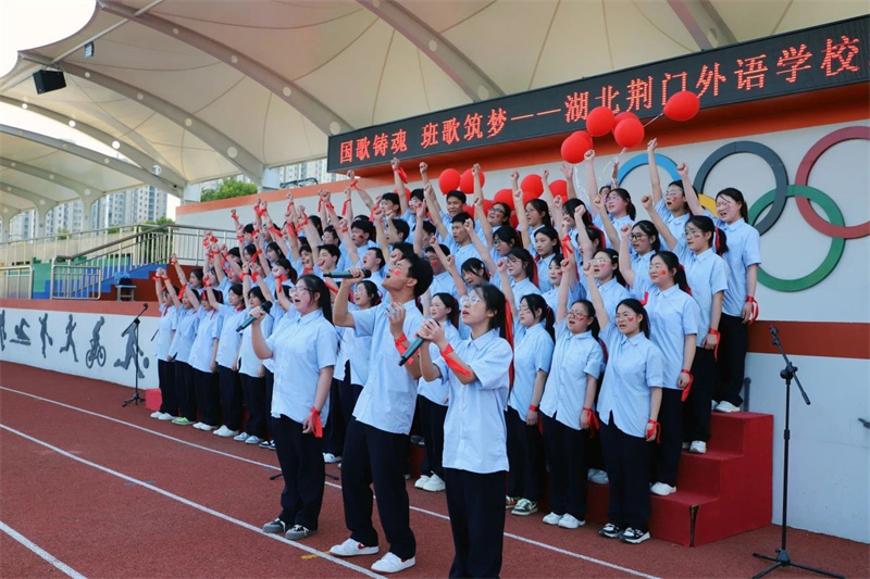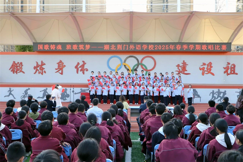 湖北荆门外语学校始终践行“以美育人、以文化人”的理念。2025年3月21日下午成功举办了“国歌铸魂 班歌筑梦”歌唱比赛。这次比赛,既是艺术素养的展示,更是德育实践的课堂:在国歌中感悟信仰的重量,理解“中华民族到了最危险的时候”不仅是历史回响,更是居安思危的警钟;在班歌中体会协作的温度,懂得“一个人可以走得快,一群人才能走得远”的成长真谛;在排练中锤炼坚持的品格,那些课后反复磨合的时光,终将成为青春最美的勋章。
