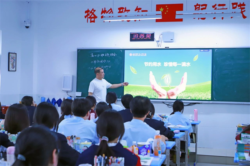 3月24日,全校师生齐聚操场参加节水主题升旗仪式。高二(14)班张露芳同学以《水润校园,共筑节水梦》为题发表演讲,用数据揭示水资源紧缺现状,呼吁师生从“关紧水龙头、一水多用”等小事践行节水承诺。