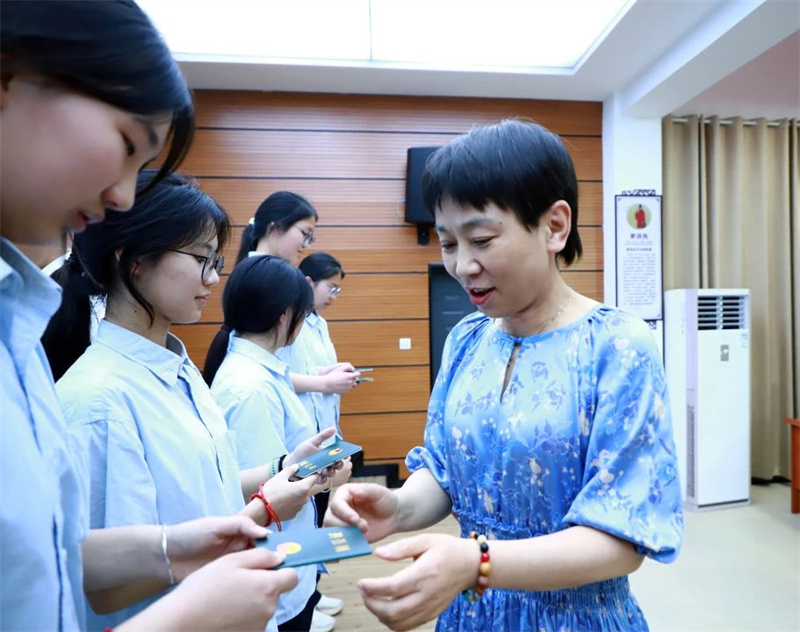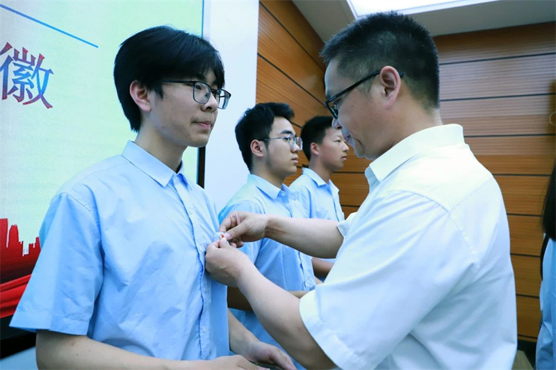 由校党委书记朱小炳、副校长林云、德育处主任杜天云依次为新团员颁发团徽、团员证和佩戴团徽。